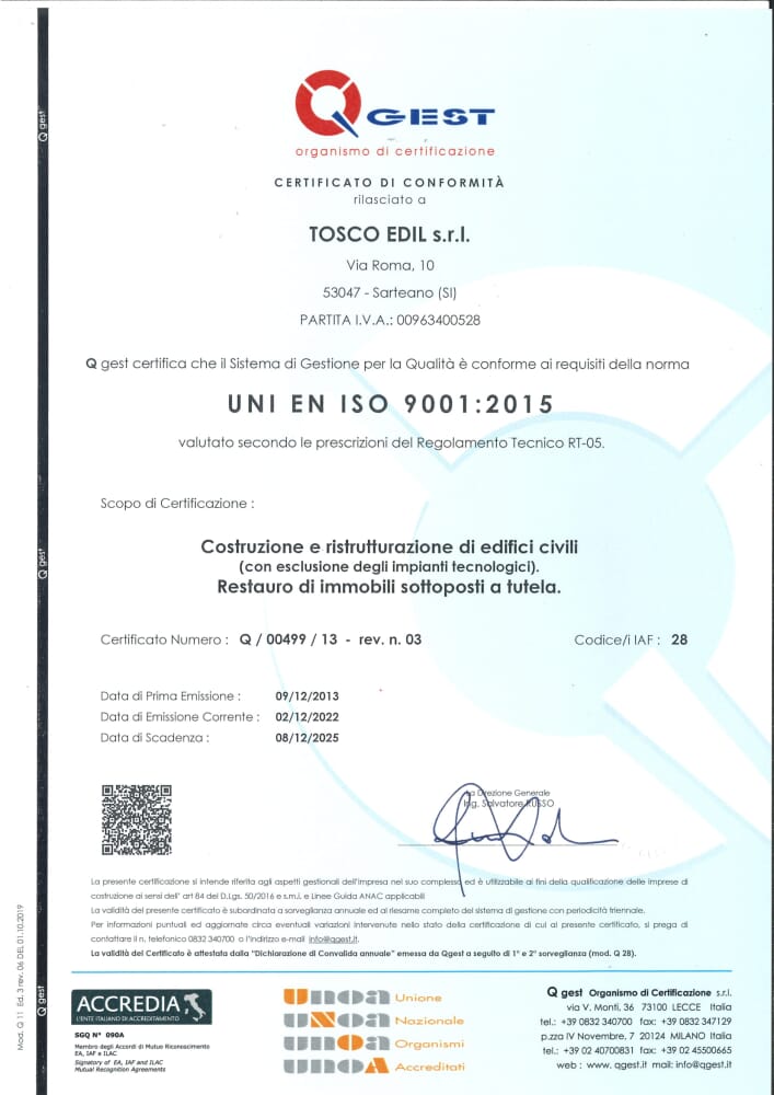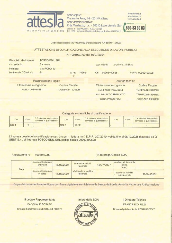 Tosco Edil è in possesso di Attestazione SOA, un’Attestazione di qualificazione per la partecipazione a gare d’appalto per l’esecuzione di opere pubbliche di lavori e dimostra la capacità tecnico-economica-organizzativa dell’impresa di qualificarsi per l’esecuzione di appalti pubblici e conferma inoltre che l’Azienda che la detiene sia in possesso di tutti i requisiti necessari alla contrattazione pubblica. Tosco Edil è in possesso delle seguenti categorie SOA: OG1 – EDIFICI CIVILI E INDUSTRIALI che riguarda la costruzione, la manutenzione o la ristrutturazione di interventi puntuali di edilizia occorrenti per svolgere una qualsiasi attività umana, diretta o indiretta, completi delle necessarie strutture, impianti elettromeccanici, elettrici, telefonici ed elettronici e finiture di qualsiasi tipo nonché delle eventuali opere connesse, complementari e accessorie, in Classifica V: (5.165.000,00 € + incremento 20% = fino a 6.198.000,00 €) OG2 – RESTAURO E MANUTENZIONE DEI BENI IMMOBILI SOTTOPOSTI A TUTELA AI SENSI DELLE DISPOSIZIONI IN MATERIA DI BENI CULTURALI E AMBIENTALI, che riguarda lo svolgimento di lavorazioni specialistiche necessarie a recuperare, conservare, consolidare, trasformare, ripristinare, ristrutturare, sottoporre a manutenzione gli immobili di interesse storico soggetti a tutela a norma delle disposizioni in materia di beni culturali e ambientali. Riguarda altresì la realizzazione negli immobili di impianti elettromeccanici, elettrici, telefonici ed elettronici e finiture di qualsiasi tipo nonché di eventuali opere connesse, complementari e accessorie, in Classifica III-Bis: (1.500.000,00 € + incremento 20% = fino a 1.800.000,00 €)